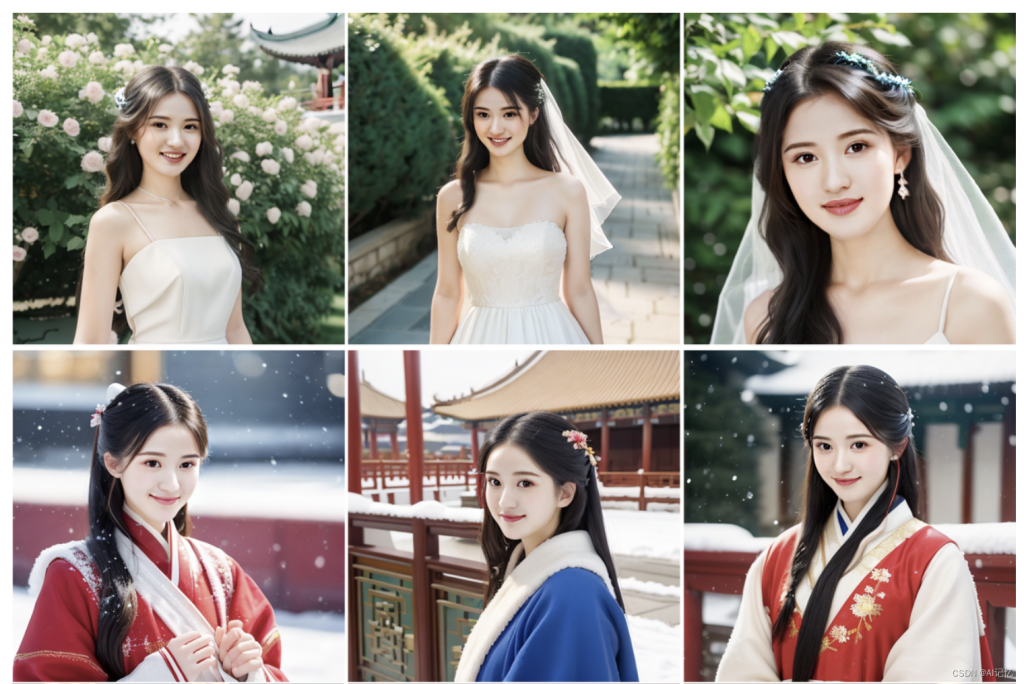 以上风格LoRA分别为:户外花园婚纱、冬季雪景汉服、火焰女神、仙侠风